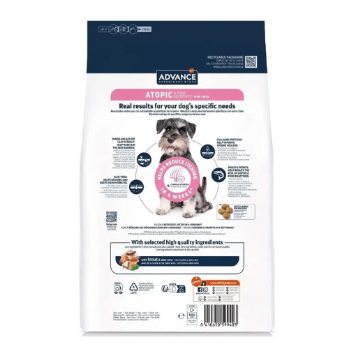 Clear1.5 kg3 kgThanks to its exclusive formula, it helps improve the appearance of the skin in dogs with atopic dermatitis, reduce scratching and restore the skin barrier, helping to control atopic flare-ups. In addition, it contains as main ingredients trout and potato, which help to reduce the risk of possible adverse reactions to pet food. The results of ADVANCE VETERINARY DIETS Atopic are clinically proven: it helps to reduce itching in 4 weeks.* ADVANCE VETERINARY DIETS Atopic Mini contains kibble specifically adapted to the size and needs of your small dog (<10 kg). We recommend you consult a vet before starting to feed with a veterinary diet. *Clinical study in atopic dogs. Internal data.