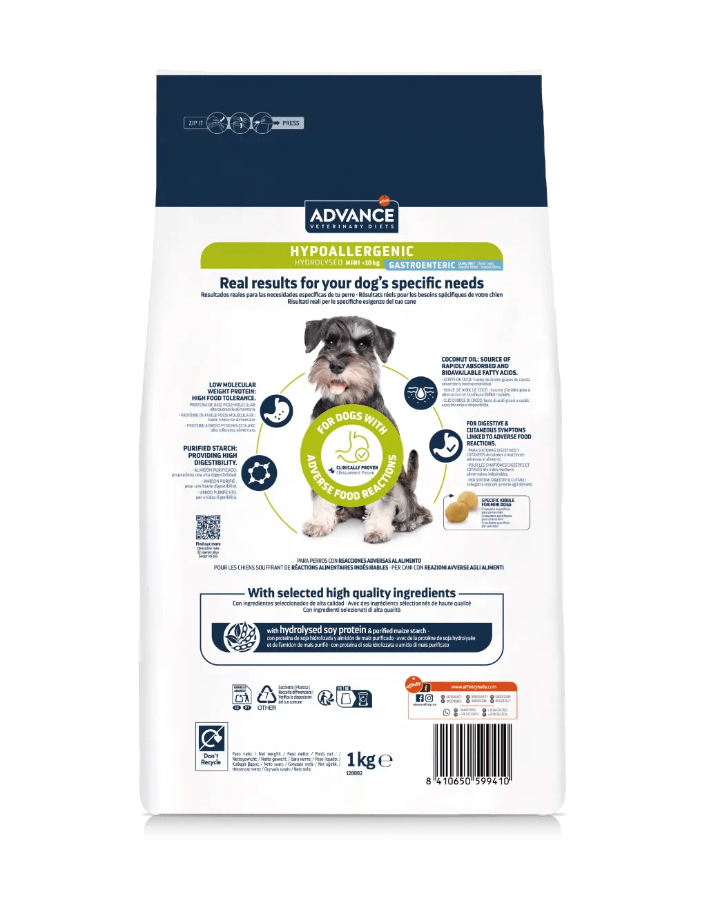 Clear1 kg2.5 kgFormulated with hydrolysed soy protein with a very low molecular weight as its single source of protein and purified starch as its single source of carbohydrates, it facilitates digestion in dogs who suffer from food allergies and intolerances. Its hypoallergenic coating also gives it a great taste. ADVANCE VETERINARY DIETS Hypoallergenic Mini contains kibble specifically adapted to the size of your small dog (<10 kg). We recommend you consult a vet before starting to feed with a veterinary diet.