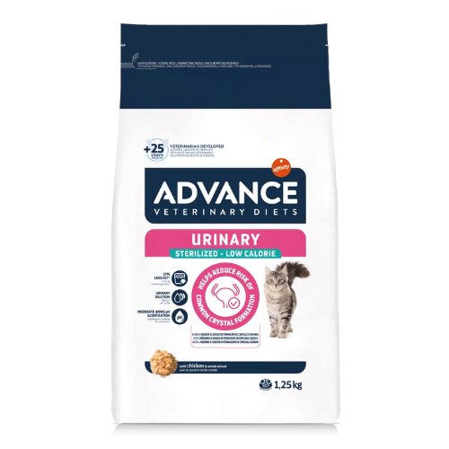 Clear1.25 kg7.5 kgFormulated with a moderate level of magnesium and urinary acidification properties, it is recommended for helping reduce the reoccurrence of struvite and oxalate stones in your cat’s urine. The results of ADVANCE VETERINARY DIETS Urinary Stress are clinically proven: it helps to reduce stress markers, a trigger for idiopathic cystitis in cats, by 54%.* (*) As indicated by the lower urinary tract stress marker. Internal study. The stress marker is reduced in comparison with the control group. We recommend you consult a vet before starting to feed with a veterinary diet.