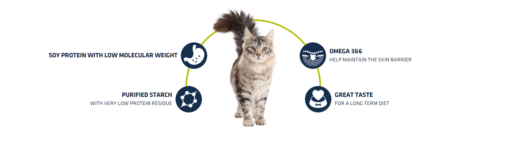Clear1.25 kg6.5 kgFormulated with hydrolysed soy protein with a low molecular weight as a source of protein and purified starch as a source of carbohydrates, it facilitates digestion in cats who suffer from food allergies and intolerances. It also helps to keep the skin healthy with fatty acids, such as omega 3, omega 6 and zinc. Its hypoallergenic coating gives it a great taste. We recommend you consult a vet before starting to feed with a veterinary diet.