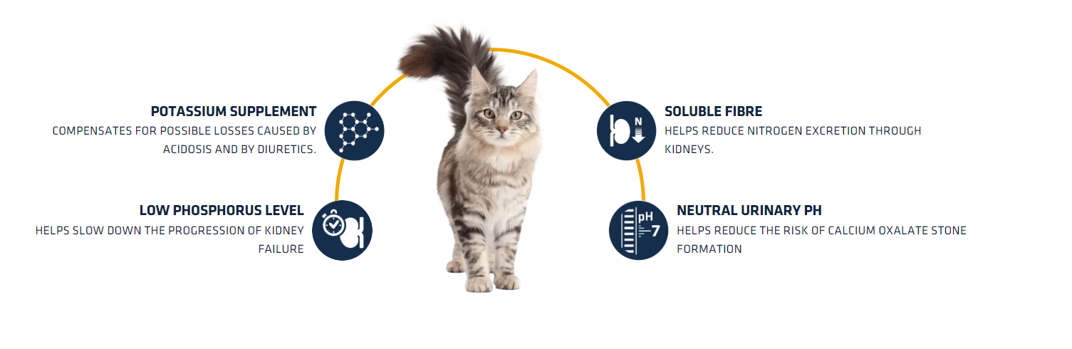 Clear1.5 kg8 kgIt is specially recommended for supporting kidney function in cats with chronic kidney disease. Its soluble fibre content and moderate level of sodium help facilitate kidney function and reduce the progress of kidney failure. In addition, it helps reduce the risk of oxalate stone formation. We recommend you consult a vet before starting to feed with a veterinary diet.