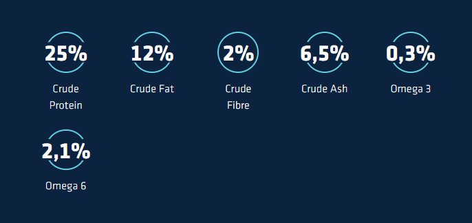 Rice (25%), whole maize, turkey (13%), dehydrated poultry proteins, chicken (7%), maize protein, dehydrated pork proteins, coconut oil (3.3%), hydrolysed animal proteins (poultry, pork, fish), beet pulp (2%), wheat middlings, minerals, chicory inulin (0.4%), pork plasma proteins (natural source of immunoglobulins) (0.4%), fish oil, soy oil, glucosamine (380 mg/kg), chondroitin sulphate (330 mg/kg).