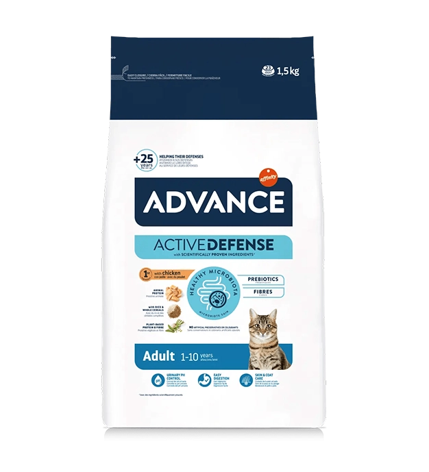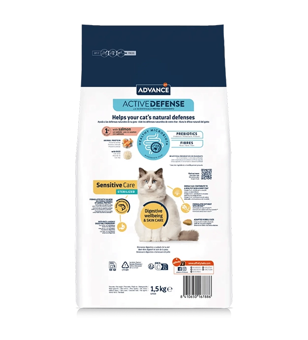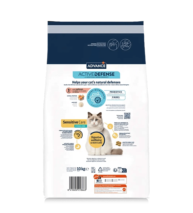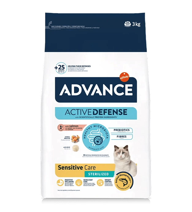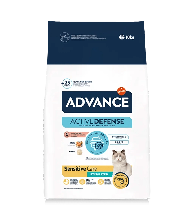 Advance Sterilized Adult Sensitive Care is specially indicated to help your sterilised adult cat’s digestion. Made with salmon as the single source of animal protein, and with rice. An animal monoprotein recipe that is easy to digest and is formulated without soya or egg. Also helps to control weight, thanks to its fibre content, and a moderate fat and calorie content. Contributes to healthy skin and a shiny coat, thanks to omega 6 and omega 3 fatty acids and zinc. The kibble size is adapted to fit an adult cat’s mouth.