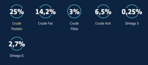 Chicken (16%), whole wheat (15%), dehydrated poultry proteins, whole maize, rice (10%), poultry fat, maize meal, dehydrated pork proteins, dehydrated peas (4%), hydrolysed animal proteins (poultry, pork, fish), maize protein, beet pulp (1.5%), pea fibre, wheat middlings, minerals, chicory inulin (0.4%), pork plasma proteins (natural source of immunoglobulins) (0.4%), glucosamine (390 mg/kg), chondroitin sulphate (335 mg/kg).