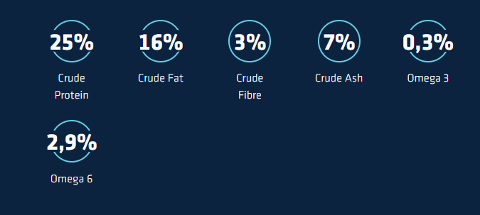 Chicken (20%), whole wheat (17%), dehydrated poultry proteins, rice (10%), poultry fat, maize meal, dehydrated peas (4%), dehydrated pork proteins, hydrolysed animal proteins (poultry, pork, fish), whole maize, maize protein, beet pulp (2%), pea fibre, wheat middlings, chicory inulin (0.8%), minerals, pork plasma proteins (natural source of immunoglobulins) (0.4%).