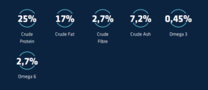 Lamb (17%), maize protein, whole maize, rice (14%), lard, dehydrated lamb proteins, dehydrated peas, maize meal, minerals, hydrolysed yeast, beet pulp, lignocellulose, fish oil, chicory inulin (0.4%).