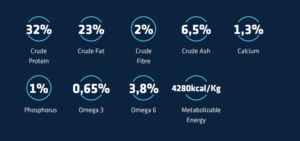 Chicken (21%), dehydrated poultry proteins, whole maize, poultry fat, rice (10%), maize protein, maize meal, dehydrated pork proteins, hydrolysed animal proteins (poultry, pork, fish), beet pulp (1.5%), minerals, pork plasma proteins (natural source of immunoglobulins) (0.4%), fish oil, coconut oil, caseinate, chicory inulin (0.4%), yeast concentrate (natural source of nucleotides) (0.04%).