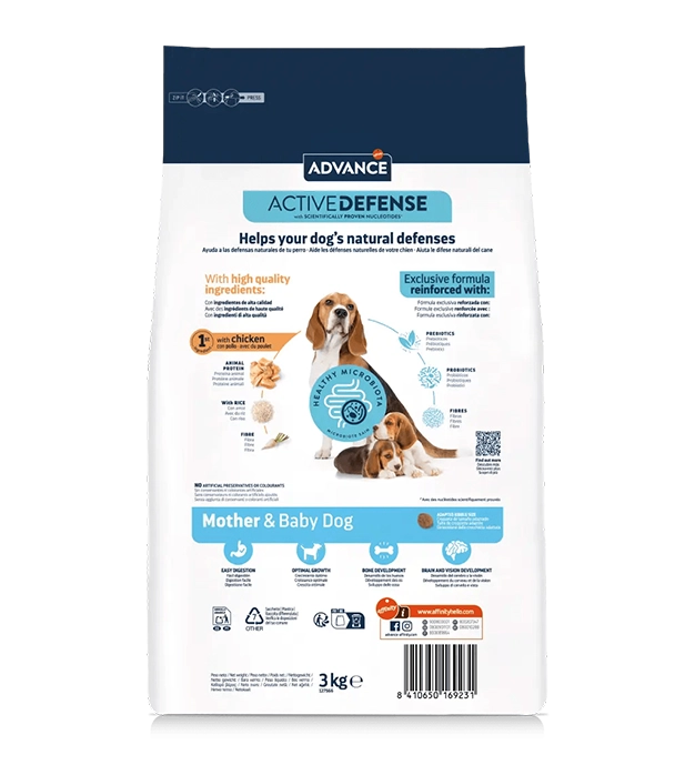 Advance Mother Dog & Baby Dog helps the defences of pregnant and lactating mothers, and puppies from their first weeks. The food is easy to digest and contributes to normal brain and vision development, and to your puppy’s healthy growth. Contains nucleotides that help to maintain the natural immune response.
