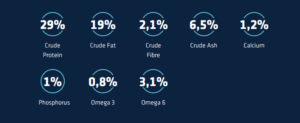 Salmon (18%), whole maize, rice (14%), maize protein, dehydrated salmon proteins, lard, hydrolysed yeast, potato protein, beet pulp, minerals, lignocellulose, chicory inulin (0.4%), fish oil, aloe vera.