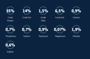 Chicken (15%), maize protein, whole wheat (12%), rice (12%), dehydrated poultry proteins, dehydrated pork proteins, maize meal, lard, hydrolysed animal proteins (poultry, pork, fish), fish oil, potassium chloride, salt, calcium sulphate, glucosamine (345 mg/kg), chondroitin sulphate (85 mg/kg).