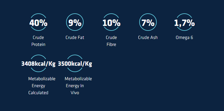Maize protein, dehydrated poultry proteins (including 10% dehydrated turkey proteins), maize meal, powdered cellulose, dehydrated pork proteins, pea fiber, whole barley (4%), whole maize, potato protein, wheat protein, hydrolyzed animal proteins (poultry, pork, fish), beet pulp (2%), lard, potassium chloride, salt, fish oil, pork plasma proteins (natural source of immunoglobulins) (0.5%), fructo-oligosaccharides (0.5%), olive oil, flaxseed.