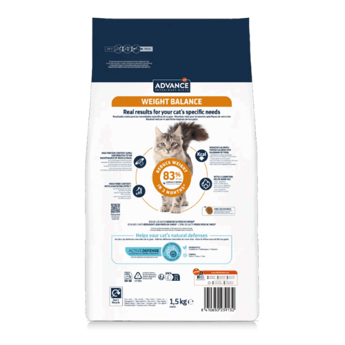 ADVANCE VETERINARY DIETS Weight Balance is a complete dietetic food for adult cats, formulated for the reduction of excessive body weight and the regulation of lipid metabolism in cases of hyperlipidemia; it is low in calories, with a low fat content and a high content of essential fatty acids. Its formula also alters the cat’s microbiota, increasing its richness and restoring it, so that it is similar to cats with an ideal weight.