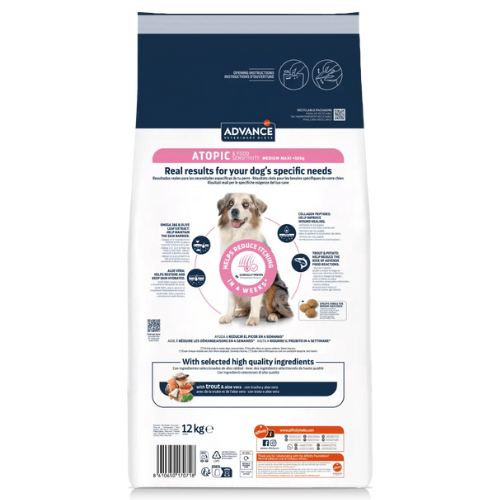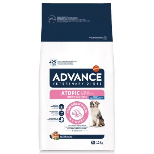 ADVANCE VETERINARY DIETS Atopic Medium/Maxi is a complete and balanced dietetic food for medium and large adult dogs and puppies over 4 months, formulated to care for the skin in cases of dermatitis and excessive coat loss, as well as to reduce intolerances to ingredients and nutrients.