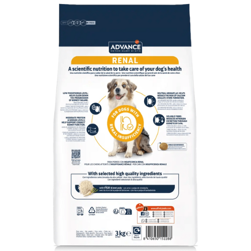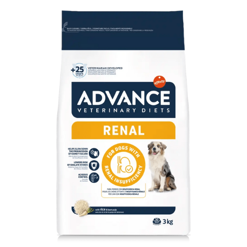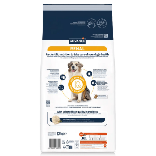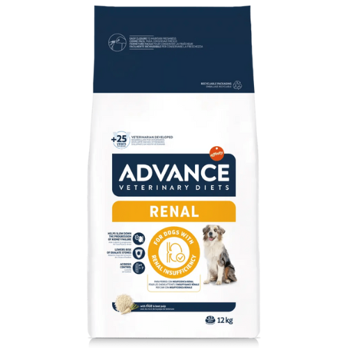 ADVANCE VETERINARY DIETS RENAL is a complete dietetic food for adult dogs with a reduced level of high-quality proteins and a low phosphorus content. It is specially recommended for supporting kidney function in dogs with chronic kidney disease.
