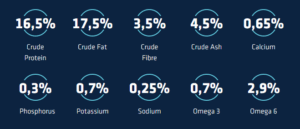 Whole maize, rice (19%), lard, dehydrated egg, maize protein, hydrolyzed animal proteins (poultry, pork, fish), sugar, beet pulp (2.5%), fish oil, powdered cellulose, potato protein, calcium carbonate, caseinate, chicory inulin, potassium chloride, salt, magnesium oxide. Protein sources: Dehydrated egg, maize protein, hydrolyzed animal proteins, potato protein, caseinate.