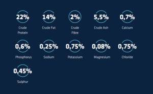 Whole maize, rice (15%), dehydrated poultry proteins (including 6% dehydrated chicken proteins), maize protein, whole wheat (10%), lard, maize meal, hydrolysed animal proteins (poultry, pork, fish), dehydrated egg, beet pulp (1%), potassium chloride, calcium sulphate, fish oil, monocalcium phosphate, salt.