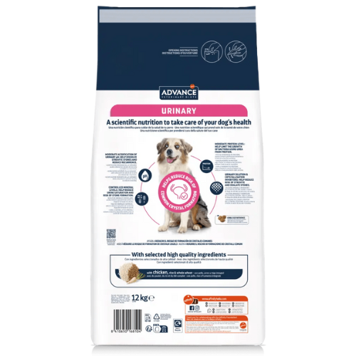 ADVANCE VETERINARY DIETS Urinary is a complete dietetic food for adult dogs, formulated with a moderate level of magnesium and urinary acidification properties, recommended for helping reduce the occurrence of struvite and oxalate stones in the urine. In addition, it has a great taste, facilitating the daily feeding of dogs with a tendency to develop bladder stones.