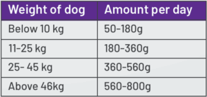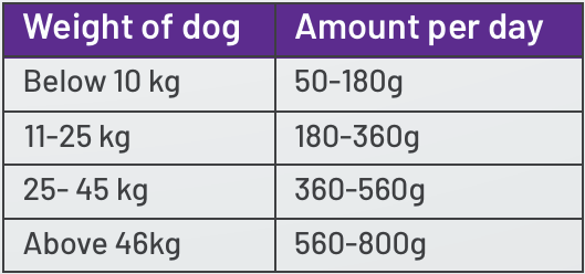 The feeding guidelines mentioned below are starting points and to keep your dog in an ideal body condition adjust the daily amounts according to your dog’s activity level, physical condition and individual needs. If you are unsure, ask your veterinarian.